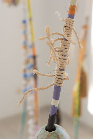 Deze magische staffen zijn een bonte verzameling van keramische objecten en gevonden materialen. De sculpturen symboliseren voor de kunstenares de mogelijkheid om de wereld met andere ogen te bekijken en daardoor deze op magische wijze om te toveren tot een mooiere plek. Deze utopische gedachte geeft haar de kracht om haar eigen gedachten en omgeving te verwerken.